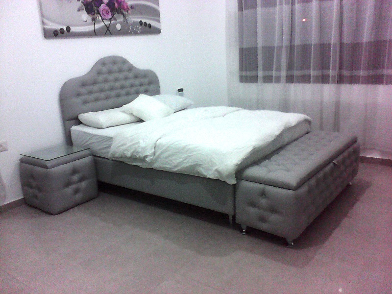 המיטה עשויה עץ מלא מרופדת בעור תעשייתי משובח או בבד איכותי עבה במיוחד, דוחה כתמים, המותאם לאקלים הישראלי, בשלל שלובי צבעים אפנתיים בקו עדין ויוקרתי, עם אבנים זוהרות או כפתורים בצבע ריפוד המיטה.